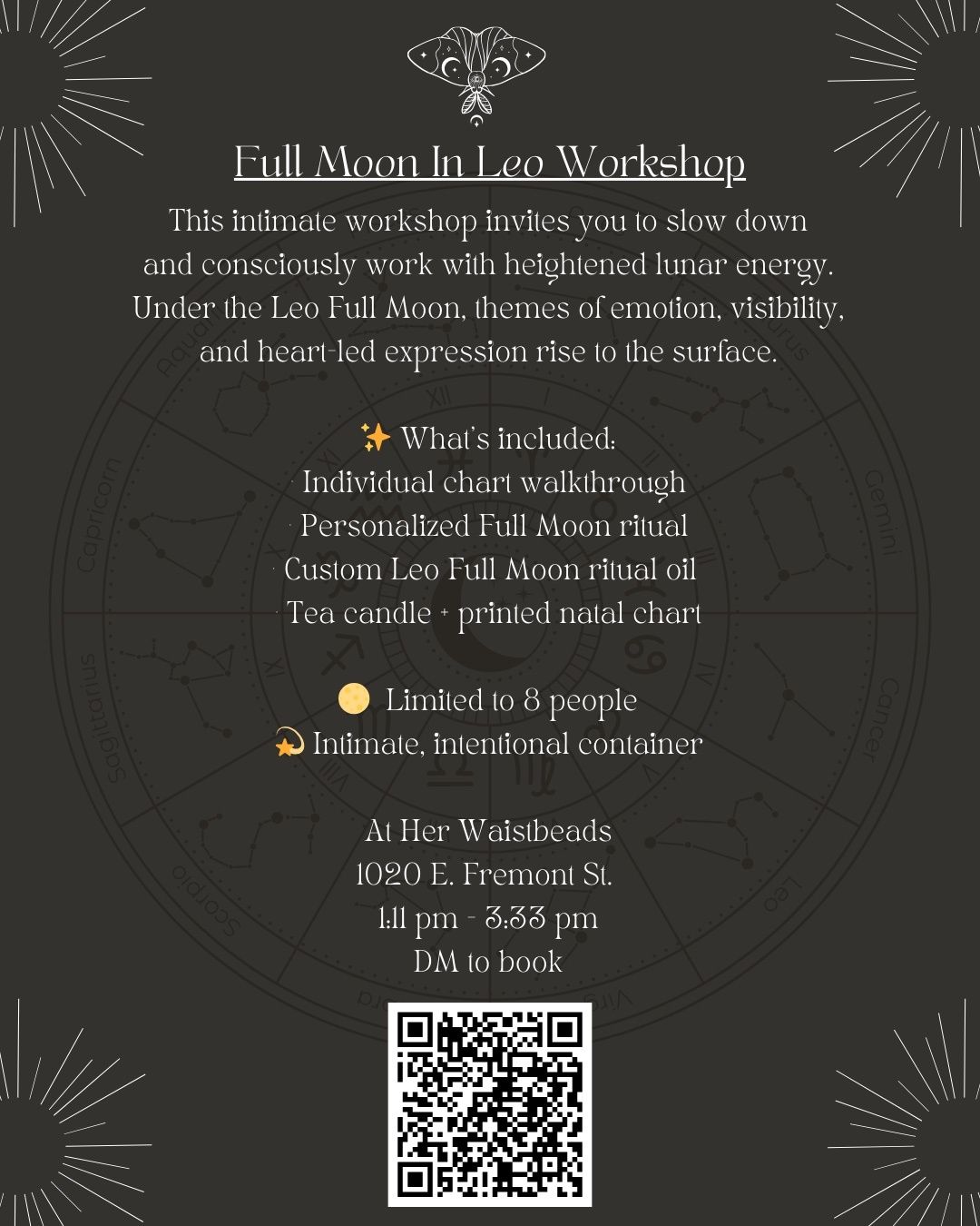 Harness Leo Full Moon energy with personalized astrology insights, guided ritual, and intention-setting in an intimate workshop designed for clarity, confidence, and activation.