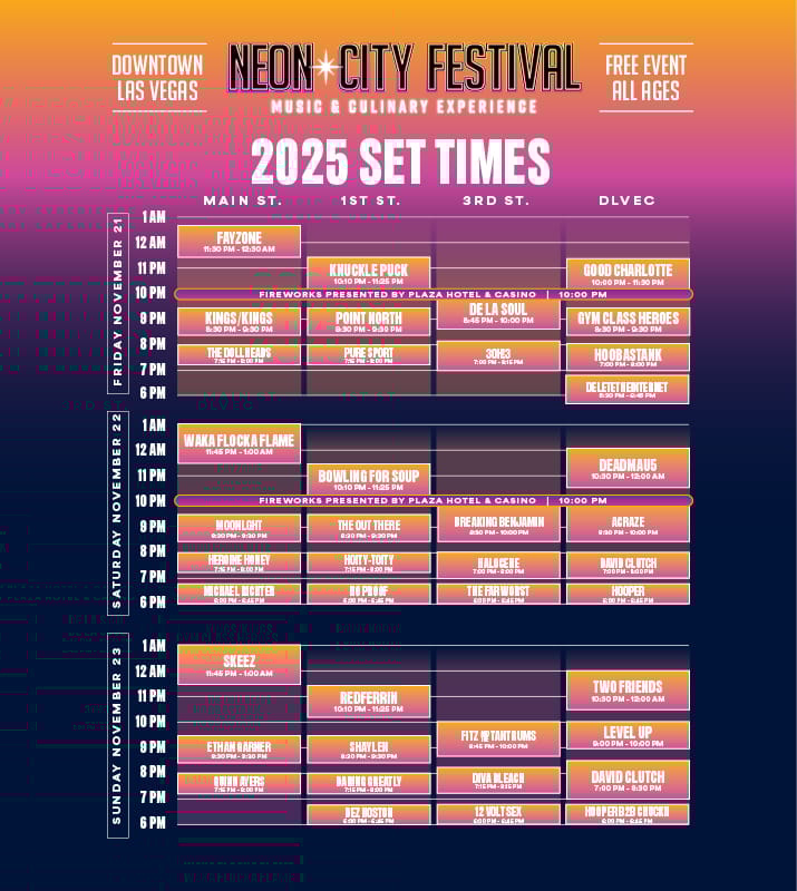 The Neon City Festival stretches across the heart of Downtown Las Vegas, transforming the streets into a vibrant celebration of sound and energy. Shows unfold on three dynamic stages under The Canopy: the Main Street Stage nestled between Golden Gate and Circa, the 1st Street Stage located between Circa and Binion’s, and the 3rd Street Stage near Fremont, Four Queens, and the D. Plus, the Downtown Las Vegas Events Center joins the party, amplifying the experience with even more excitement.